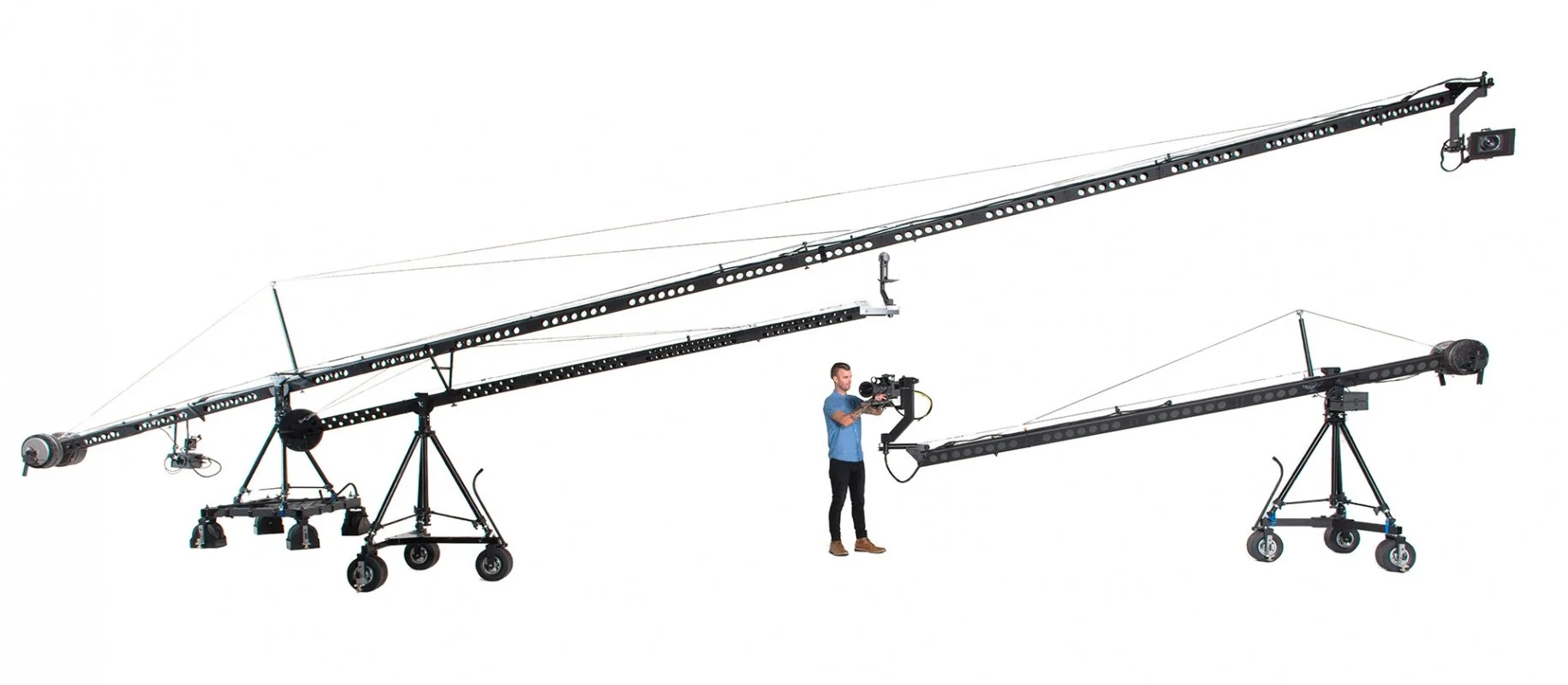 TechnoJib (15’ & 24’): The premier choice for dynamic, linear movement in sophisticated studio environments and tight stage footprints. Its telescoping arm allows for complex maneuvers that fixed-arm cranes cannot execute.